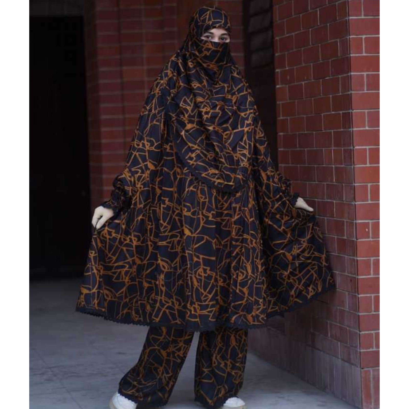 Abstract Pattern Long Khimar Set – আভিজাত্য ও আধুনিকতার অনন্য সংমিশ্রণ আপনি কি এমন একটি পোশাক খুঁজছেন যা আপনাকে একই সাথে একটি প্রিমিয়াম লুক দিবে এবং পরিপূর্ণ পর্দা নিশ্চিত করবে? আমাদের নতুন Black & Copper Abstract Palazzo Khimar Set আপনার ব্যক্তিত্বে আনবে এক রাজকীয় আভা। কালো কাপড়ের ওপর উজ্জ্বল কপার রঙের অ্যাবস্ট্রাক্ট ডিজাইন এই সেটটিকে দিয়েছে অত্যন্ত গর্জাস এবং ইউনিক একটি লুক。 যারা সাধারণ নরমাল বোরকার বাইরে একটু ট্রেন্ডি এবং আরামদায়ক আউটফিট খুঁজছেন, তাদের জন্য এই খিমার সেটটি একটি সেরা পছন্দ。